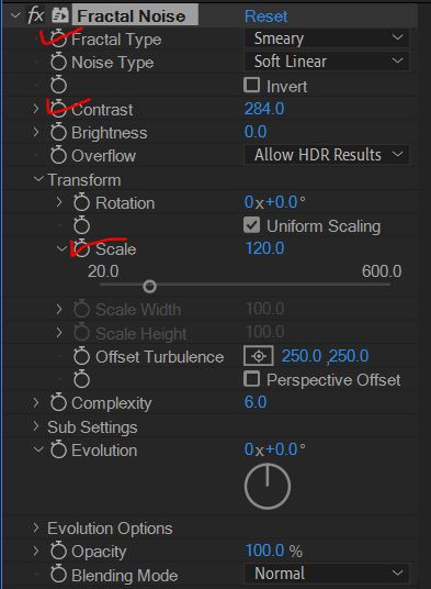 소스 레이어에서 Fractal Noise Type과 속성들을