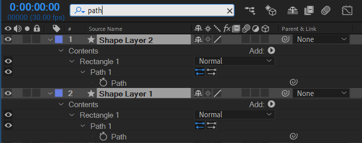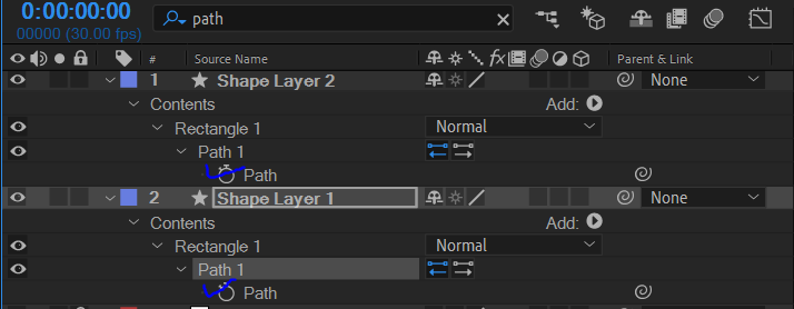 두 개의 Shape Layer을 선택한 뒤 돋보기 공간에 path라고 적으면